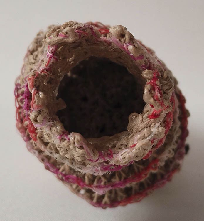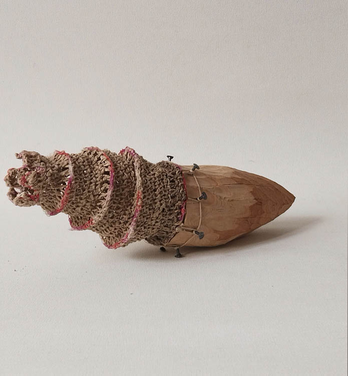 This project is carried out using four different techniques: spinning, weaving, carving, and modeling. First, the spinning technique employs hemp thread, produced manually with a spinning wheel. The weaving is done with jute, esparto grass, and hemp, all natural materials. As for the wooden volumes, these are created through direct carving with gouges. In addition, the project includes a hand-modeled clay piece.