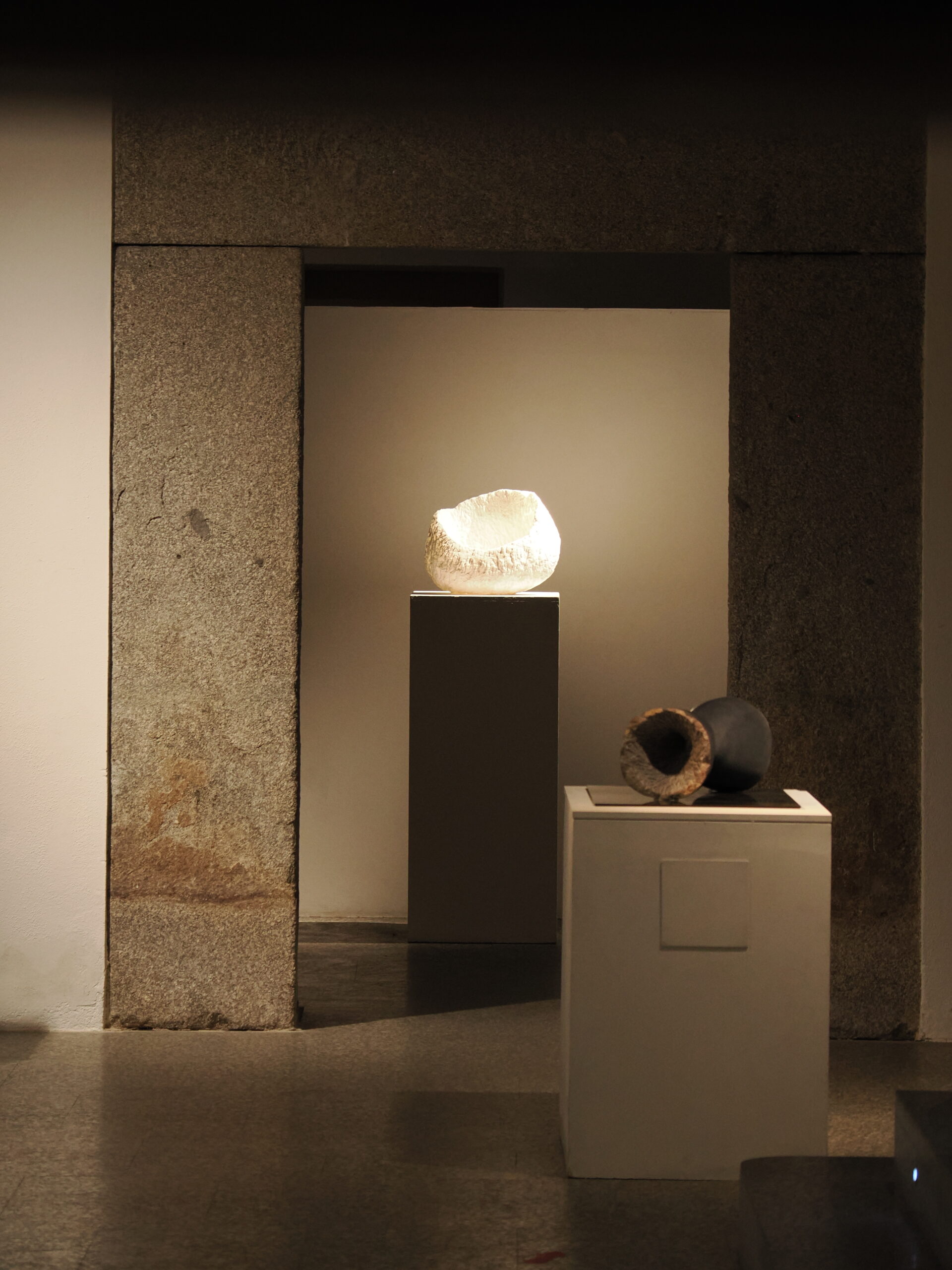 The Eduardo Chicharro space at Palacio Los Serrano hosts this solo exhibition as a sculptural journey that engages in dialogue with the underground architecture of the space. The descending access transforms the visit into an experience akin to the geological exploration of a cave or a moment of introspection characteristic of a chapel.